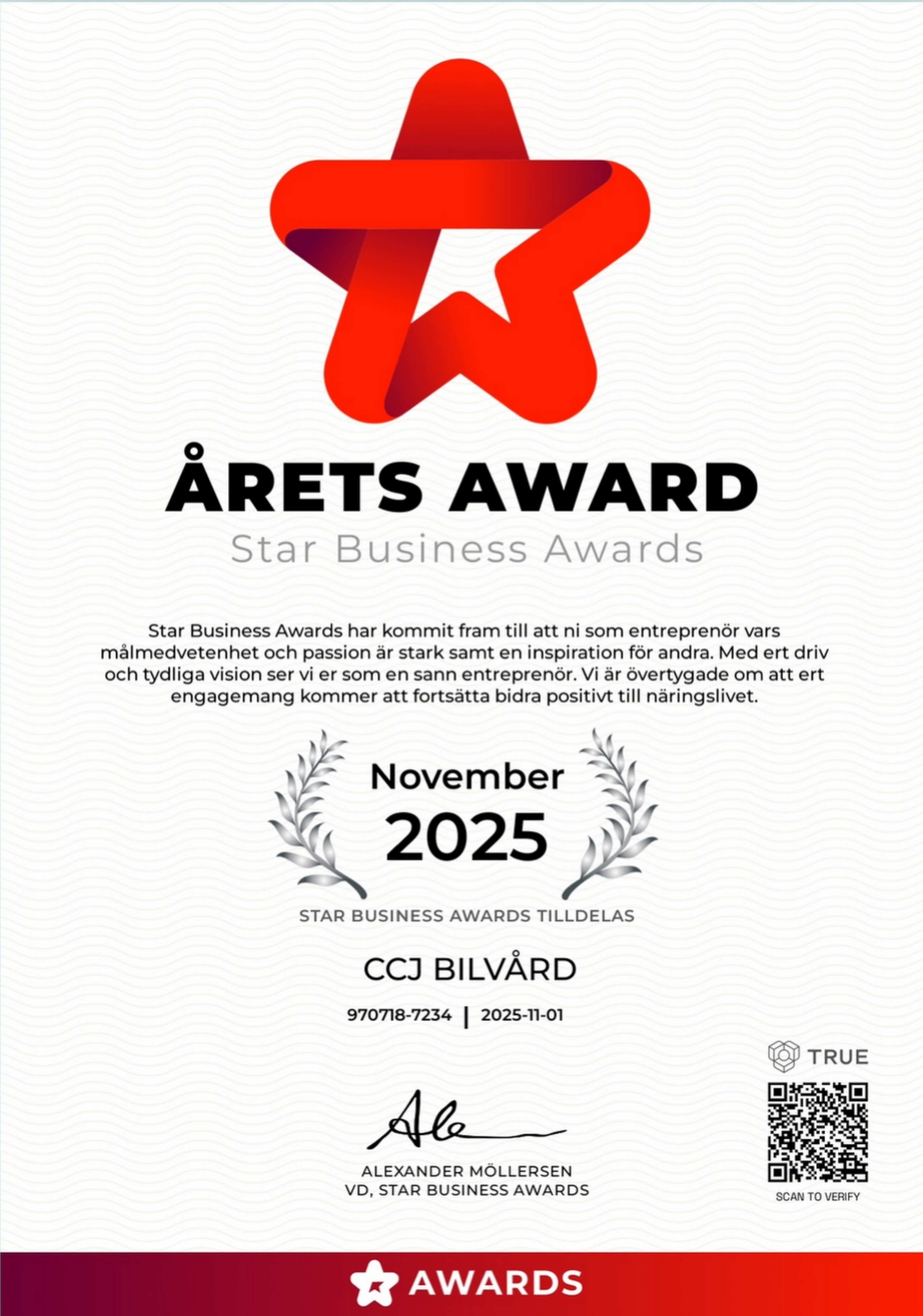 Stolt och hedrad att meddela att Nordic Shine Östersund - CCJ Bilvård tilldelats Årets Award 2025 av Star Business Awards.En utmärkelse som lyfter fram företag med stark vision, kvalitet i arbetet och genuint entreprenörskap.Tack till alla fantastiska kunder och samarbetspartners. Resan har bara börjat!